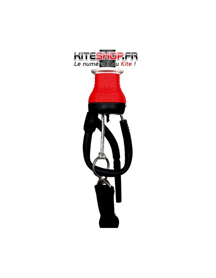 La poignée du largueur a été conçue avec une forme ergonomique permettant de facilement l’agripper pour le déclencher. Une collerette en matière souple a été ajoutée sur le haut de celle-ci pour améliorer le grip et le confort, car lors de la navigation, lorsque la barre est complétement pivotée il peut arriver que les mains du rider viennent toucher le largueur.