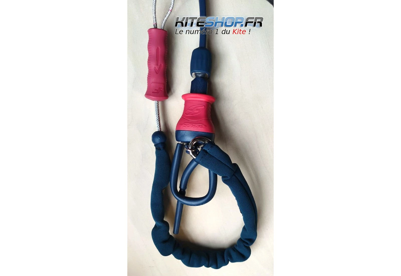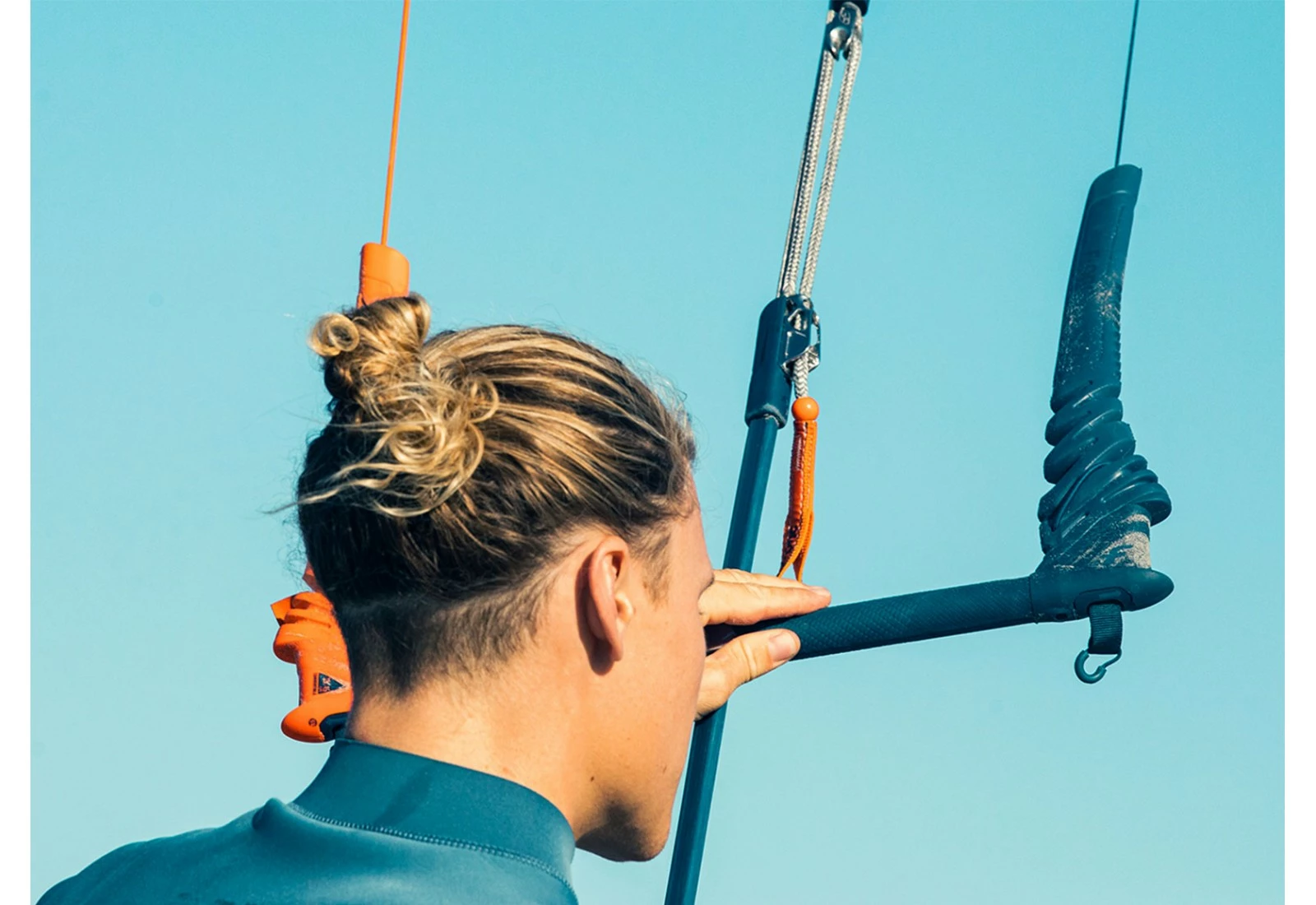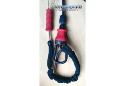 Une aide à la flottaison est placée au-dessus de la trim afin que la barre puisse flotter en cas de largage. Le code couleur de la barre est très claire avec de l’orange à gauche et du bleu à droite. Les lignes se terminent en têtes d’alouette pour être attacher aux pigtails des bridages.
