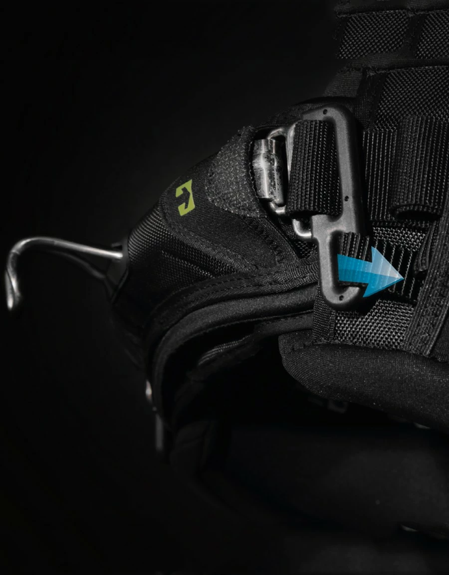 Assistant le Down-Hold System, deux oreilles placées sur les extrémités de la boucle viennent s’insérer dans le harnais. Une fois les sangles serrées, celles-ci sont compressées et verrouillées.