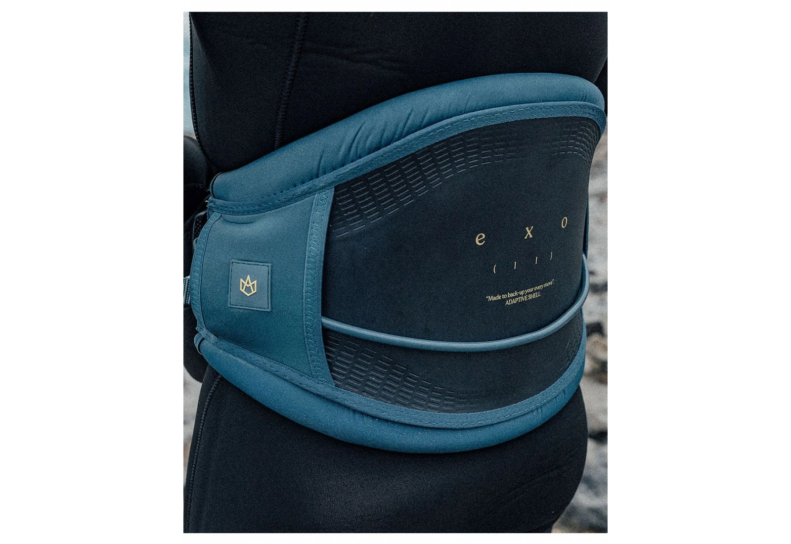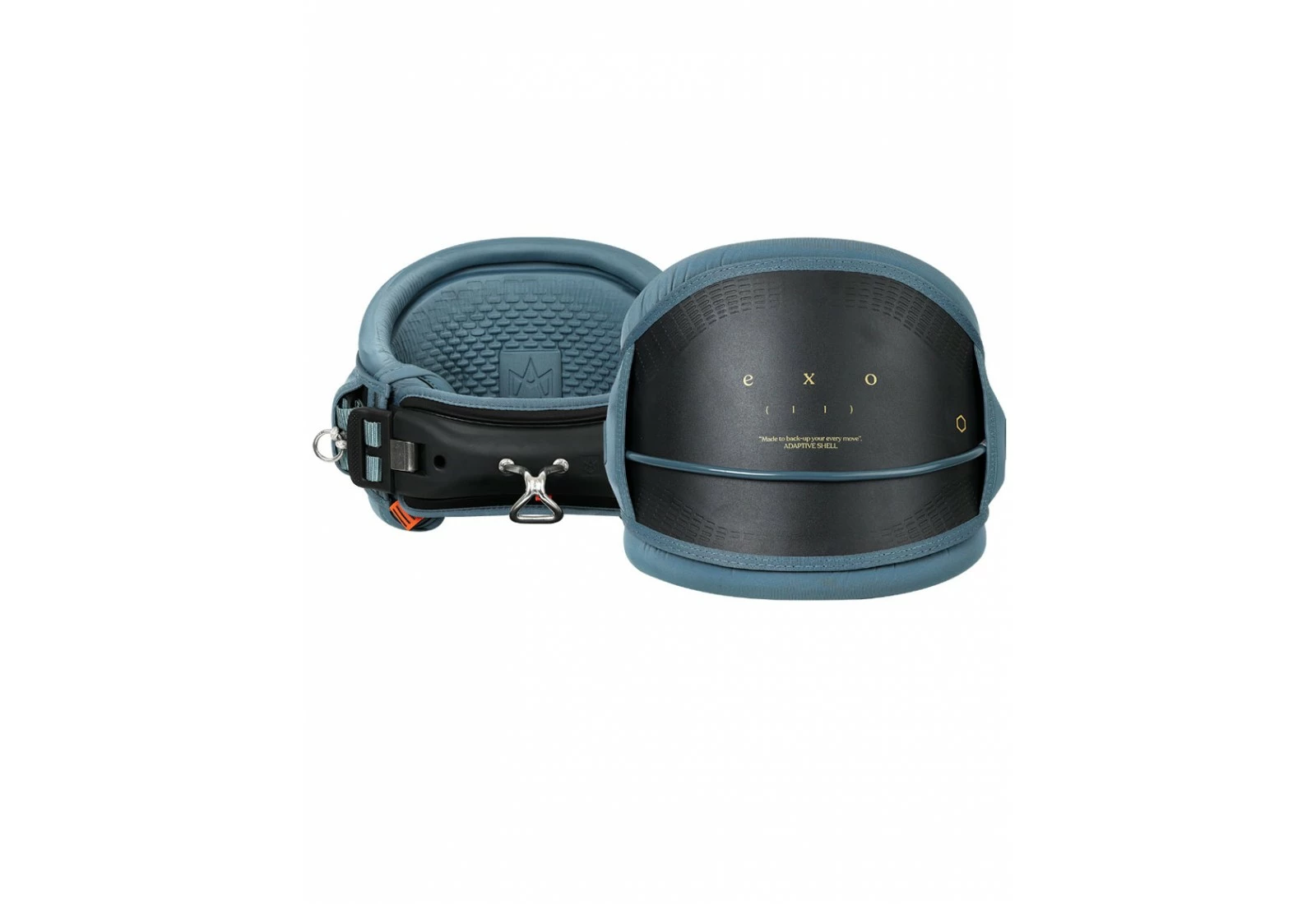 La rigidité de l’“Adaptive shell” décroit entre une partie centrale rigide et des côtés flexibles. La ceinture centrale rigide empêche le harnais de se replier en deux et de compresser le rider, tout en préservant un bon soutient lombaire. Le contour plus flexible offre une mobilité intuitive et s’adapte aux mouvements Le harnais est donc rigide là où le dos a besoin de support, et flexible lorsqu’il a besoin d’adaptabilité.