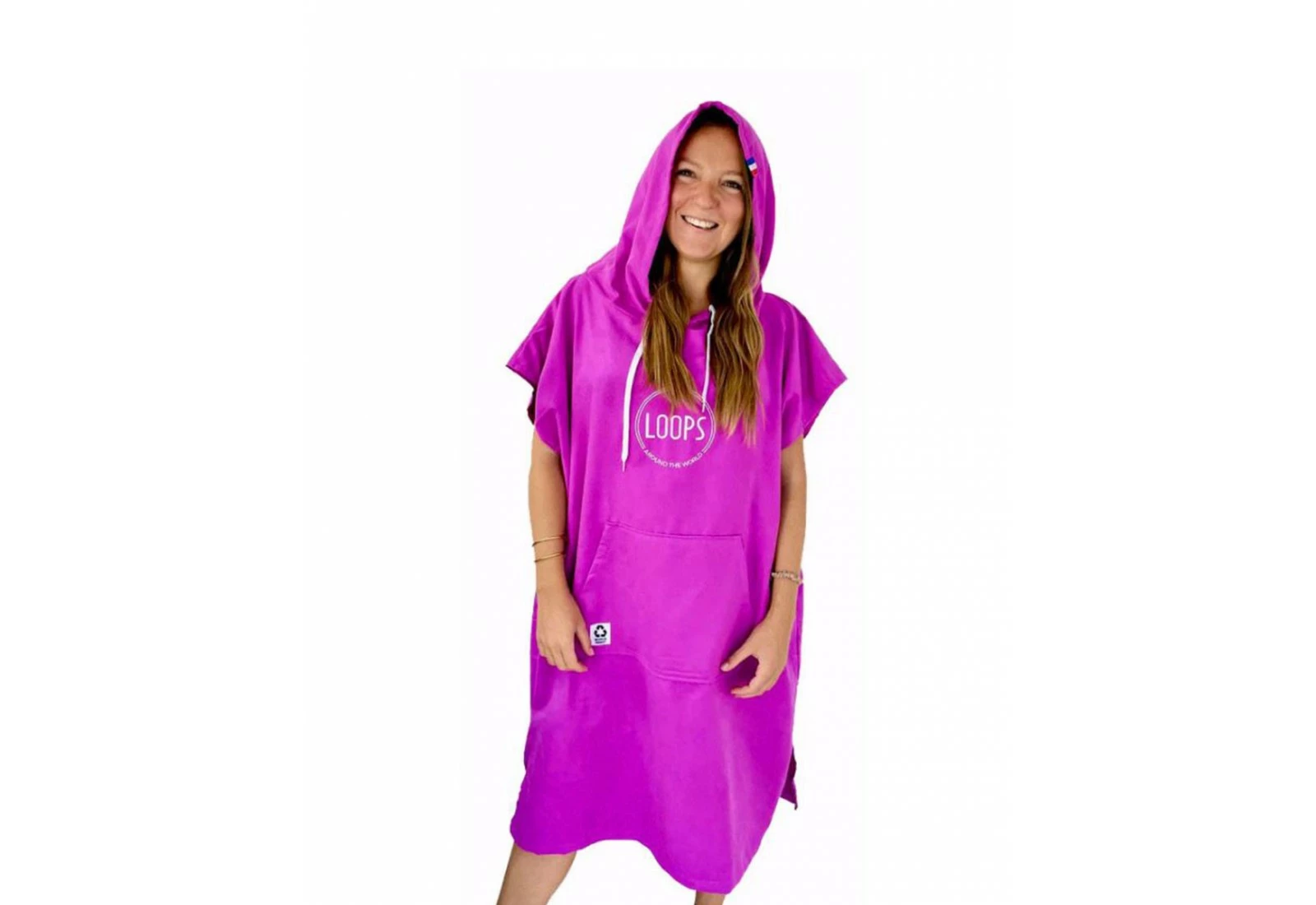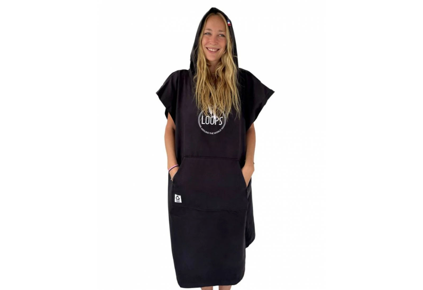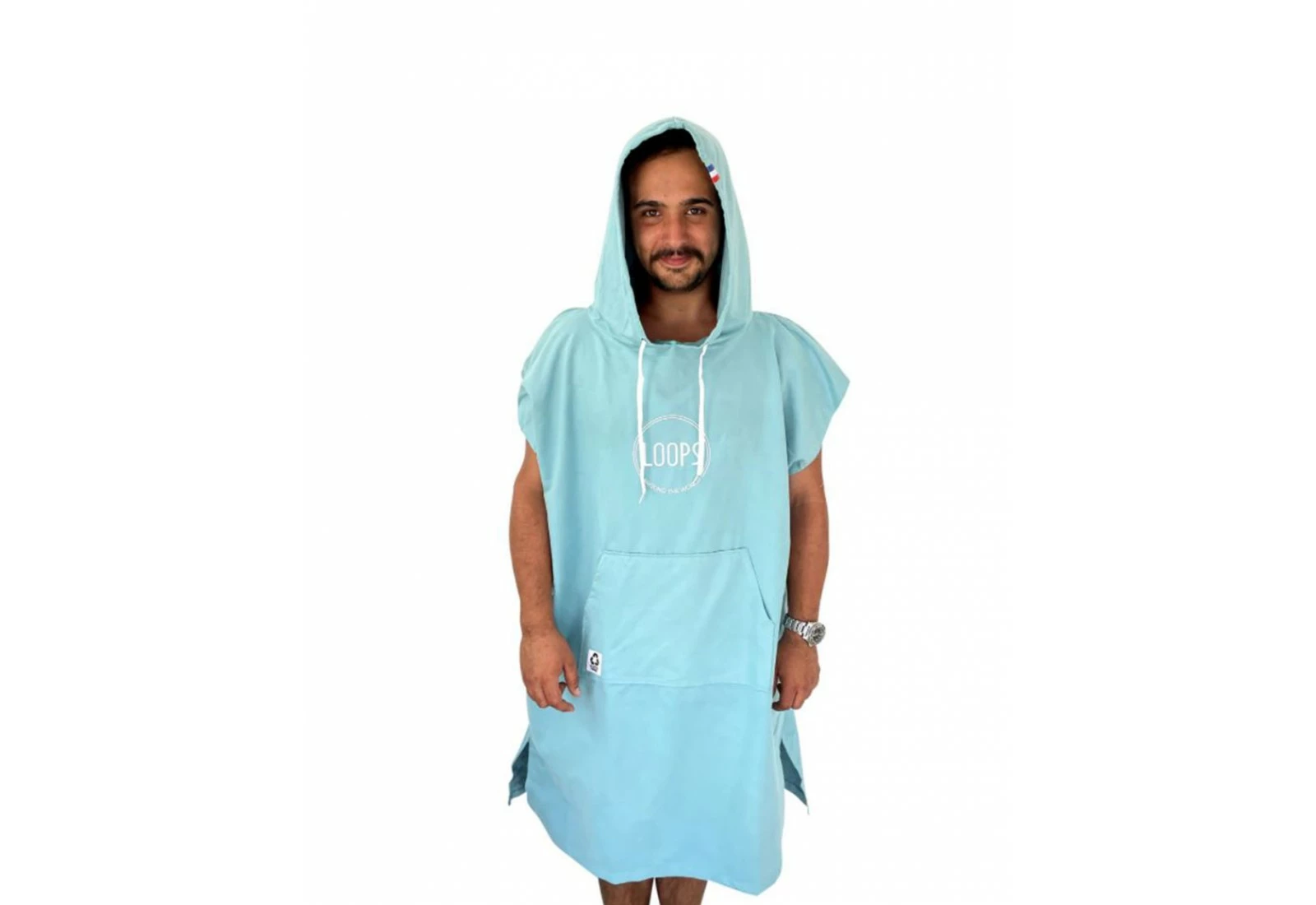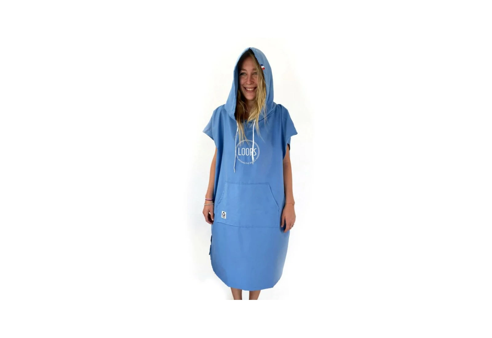 Le poncho Loops est fabriqué en microfibres recyclés, il est disponible en plusieurs couleurs et bénéficie d’une capuche et d’une poche « kangourou » pour plus de confort.